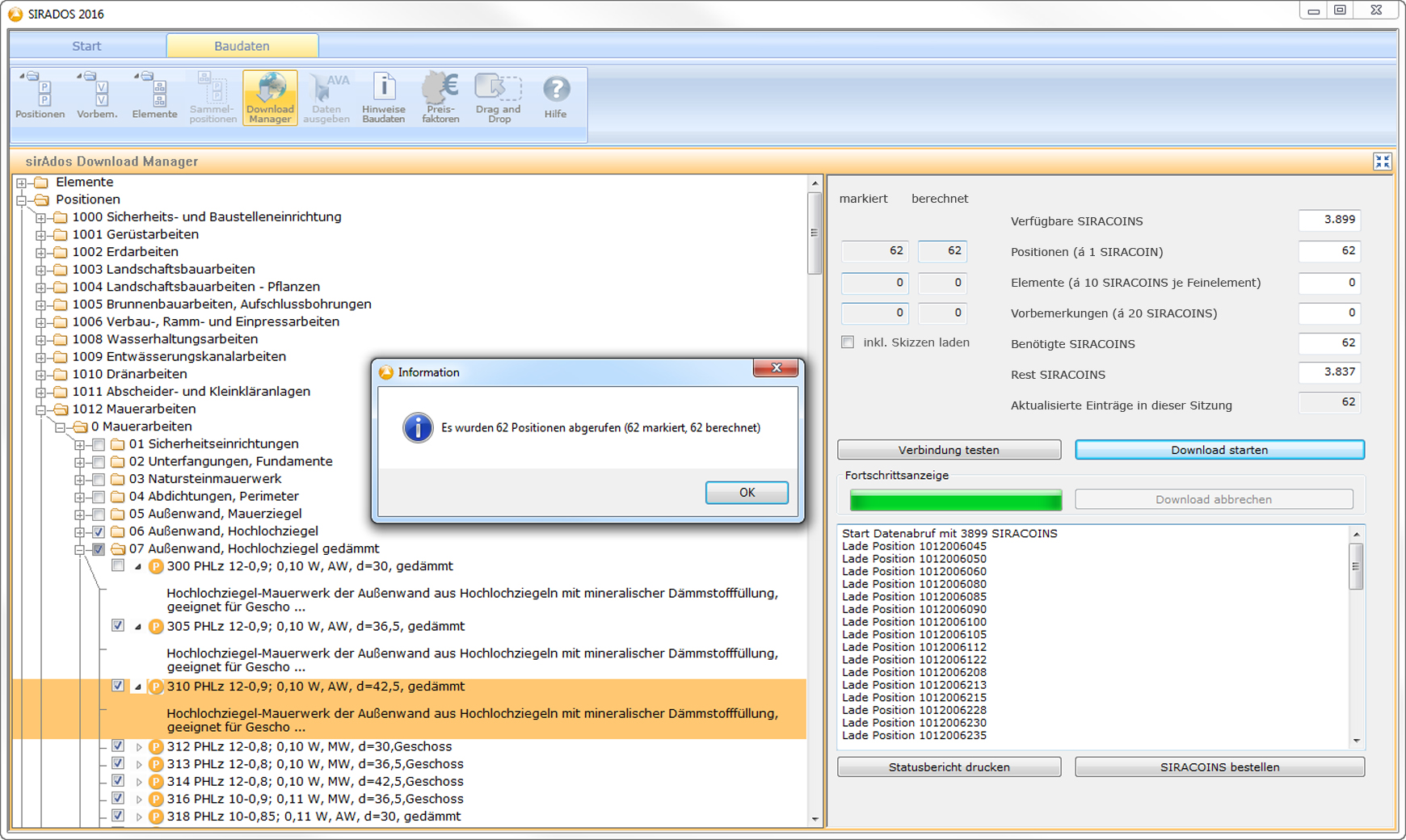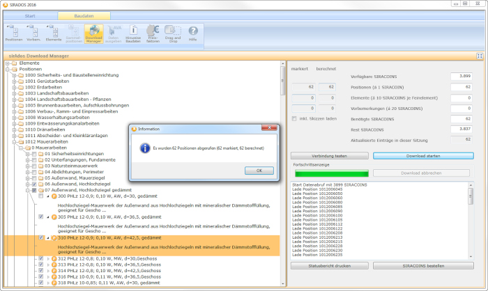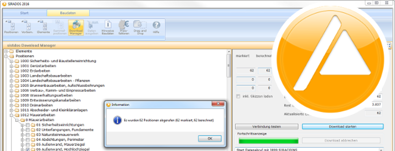 Der Download Manager nimmt Verbindung zur aktuellen SIRADOS Online Datenbank auf. Anhand des Kurztextes wählt der Anwender die gewünschten Positionen, Elemente oder Vorbemerkungen aus und lädt die aktuellen Daten auf Knopfdruck in seinen Download Manager.